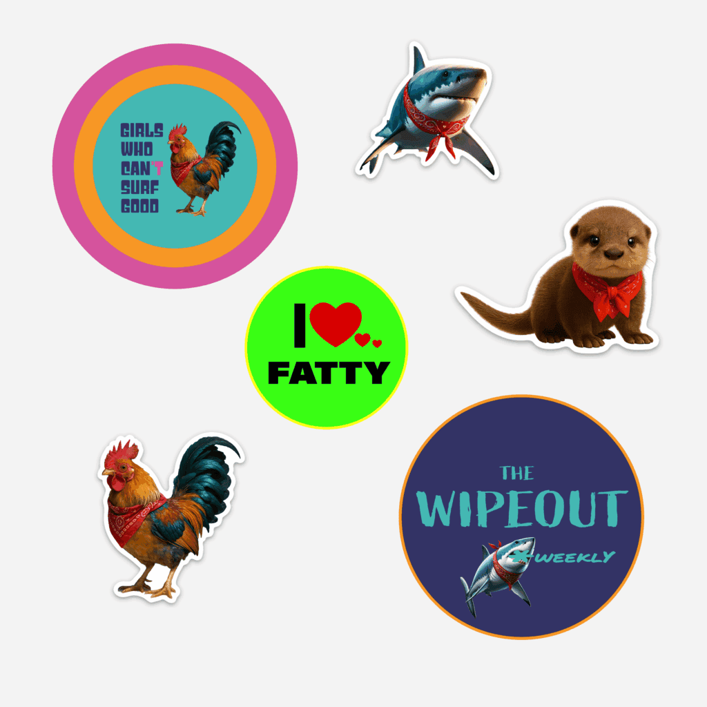 Super duper sticker pack includes The Wipeout Weekly dot sticker, Girls Who Can’t Surf Good dot sticker, “I Love Fatty” wee dot sticker, Jaws JJ Junior die cut sticker and Olo the Rooster die cut sticker. Never glossy, always vinyl!