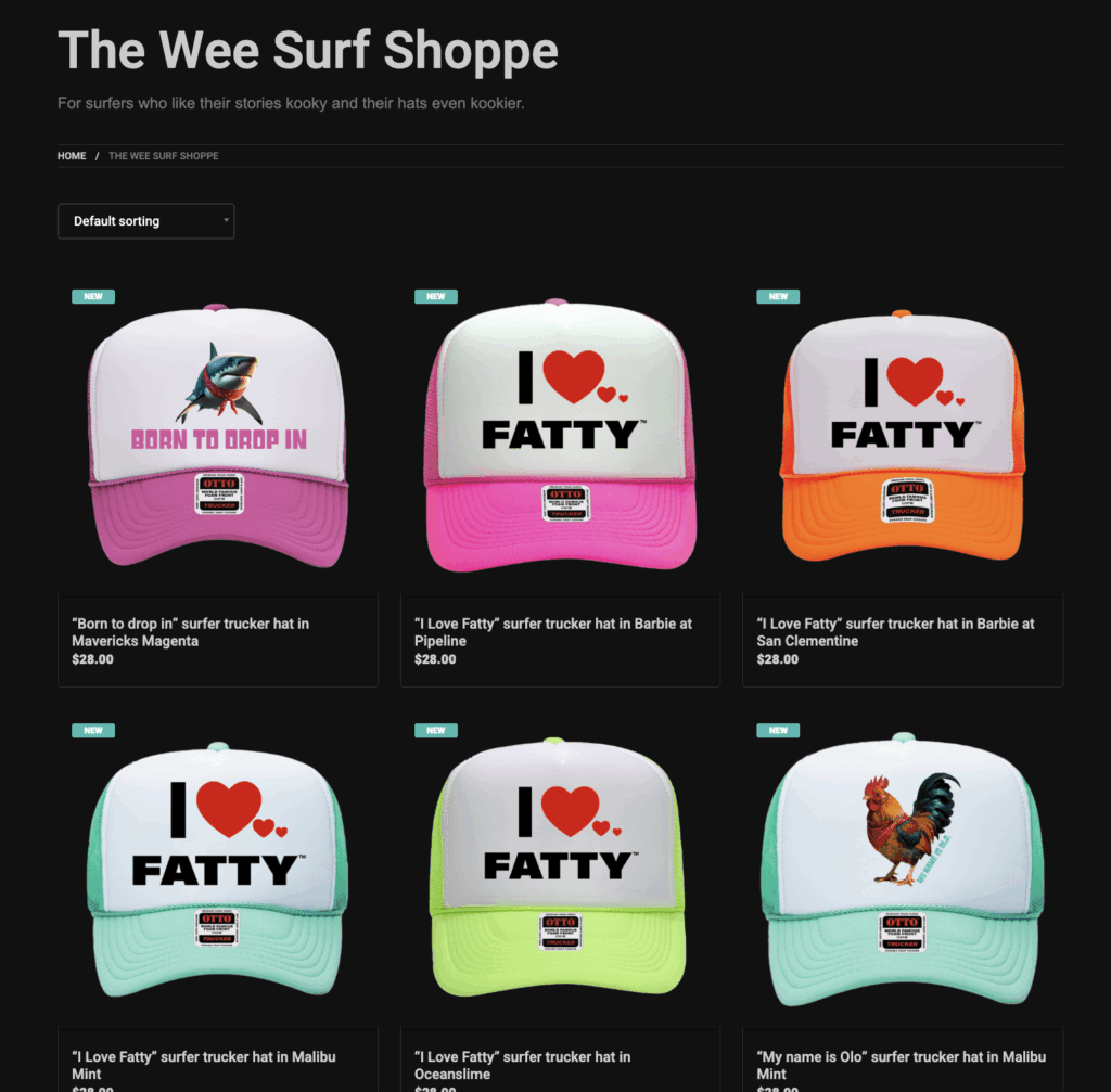 Hold on… I can get an I Love Fatty hat? Yes. Yes, you can. In a week or so when we launch The Wee Surf Shoppe.